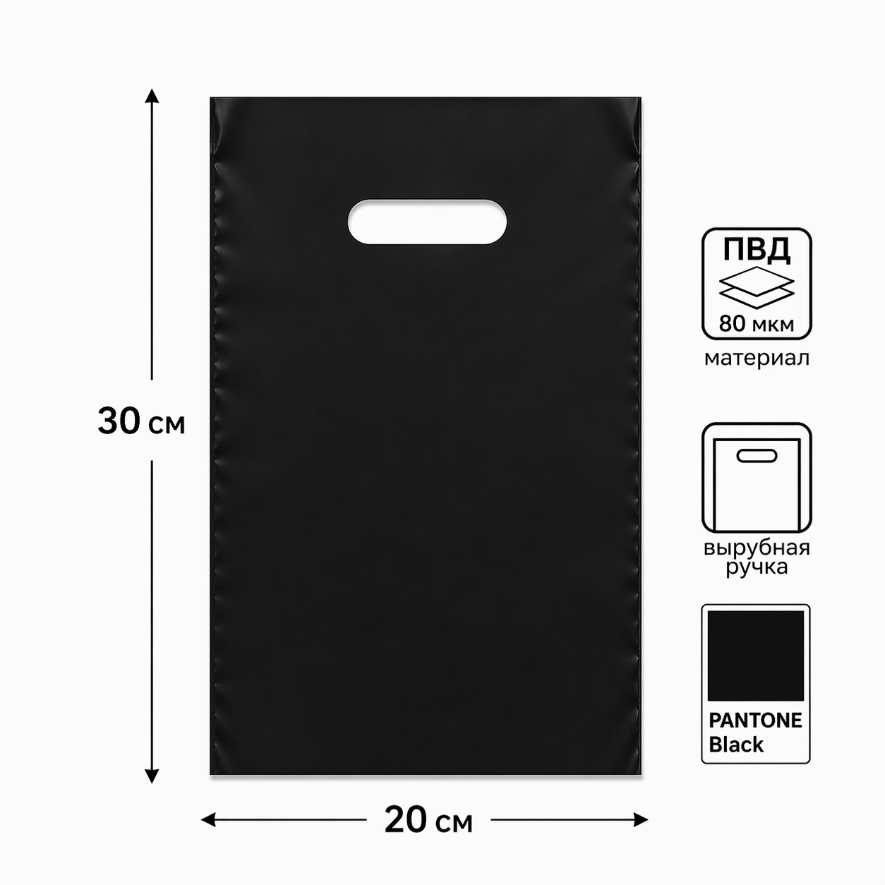 Черный полиэтиленовый пакет с вырубной ручкой 20*30см, плотностью 80мкм, без усиления.