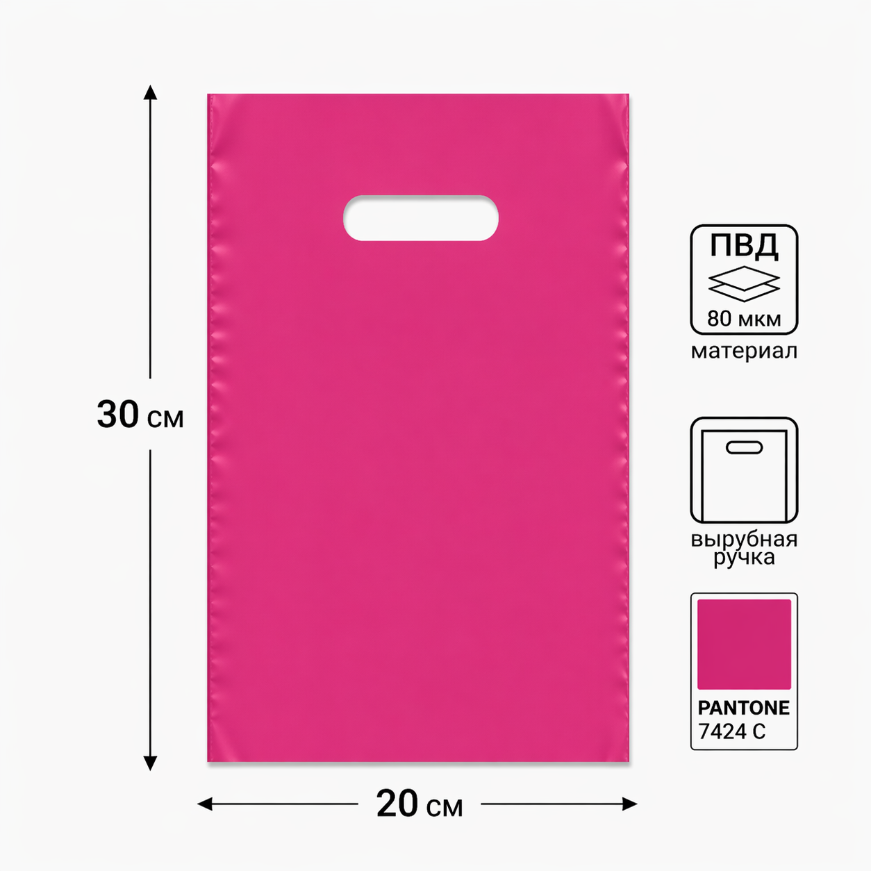 Фуксия полиэтиленовый пакет с вырубной ручкой 20*30 см, плотностью 80 мкм, без усиления.